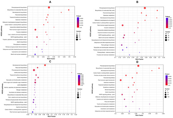KEGG pathway enrichment analysis of DEGs in carrot (Daucus carota L.) seeds under CK, HYD, and HEHP treatments. (A) Top 20 enriched KEGG pathways of the DEGs identified in CK vs. HEHP. (B) Top 20 enriched KEGG pathways of the DEGs identified in CK vs. HYD. (C) Top 20 enriched KEGG pathways of the DEGs identified in HYD vs. HEHP. (D) Top 20 enriched KEGG pathways of all the DEGs identified in CK vs. HEHP, CK vs. HYD, and HYD vs. HEHP.