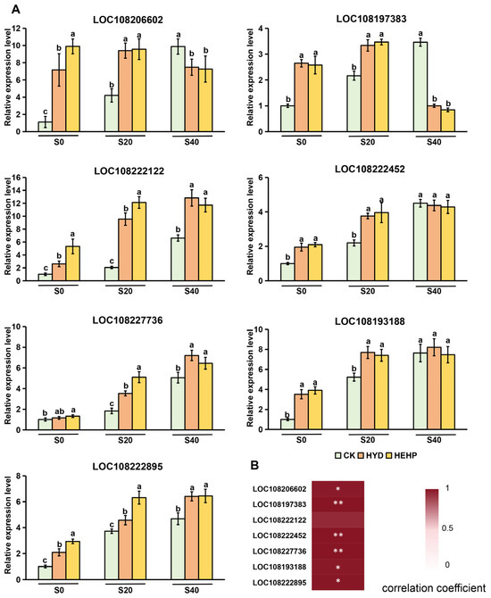 Expression patterns of cell wall remodeling genes in carrot (Daucus carota L.) seeds during imbibition (S0–S40) under CK, HYD, and HEHP treatments. (A) qRT-PCR analysis of selected DEGs in cell wall remodeling pathways at different time points. The different lowercase letters above the bars indicate significant differences in 95% probability level (p < 0.05, Duncan test was performed after ANOVA analysis) (B) Correlation analysis between the results of qRT-PCR and transcriptome (Pearson correlation coefficient was used. * means significant at the level of p < 0.05. ** means significant at the level of p < 0.01).