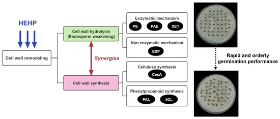 The process of cell wall remodeling in the early stage of seed swelling has received widespread attention [18,19,20]. Due to the thickening of the cell wall, the endosperm of carrot seeds has high mechanical strength. The smooth completion of germination needs to be coordinated with the decrease in the mechanical strength of the endosperm after swelling, that is, the process of endosperm weakening [21]. The post-imbibition phase requires coordinated cell wall modification and energy homeostasis to enable embryo expansion. Another research study of our group has demonstrated that the rapid germination of carrot seeds is closely related to the enzymatic loosening mechanism of endosperm weakening and that β-mannanase plays a key role in this process [22]. In addition to this, other hydrolases (e.g., pectinesterase and xyloglucan endotransglucosylases) and the important nonenzymatic factors, expansins, are also known to mediate cell wall loosening during germination [23,24,25]. At present, there are few studies reporting the role of these mechanisms in regulating the seed germination of carrots. Moreover, there is also vigorous cell wall synthesis activity (synthesis of cellulose and lignin) during the germination stage [26,27]. The secondary metabolites, like phenylpropanoids, may participate in reshaping cell wall architecture during the germination process [28,29]. The synergy of cell wall decomposition and synthesis activities is of great significance for the smooth completion of seed germination. Nevertheless, how HEHP synergy modulates these processes during germination remains unknown.