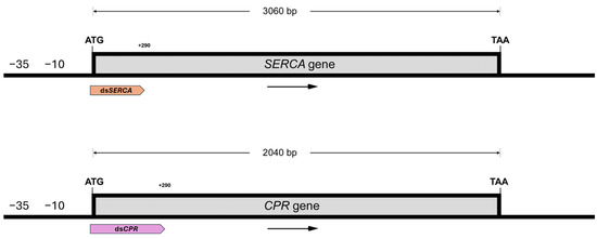 The SERCA and CPR genes were selected for silencing because their products are involved in key metabolic processes of L. decemlineata: SERCA encodes the Sarcoplasmic/Endoplasmic Reticulum-type calcium-transporting ATPase, whereas CPR encodes the NADPH–Cytochrome P450 Reductase. Their gene sequences were retrieved from the National Center for Biotechnology Information (NCBI) database (accession numbers MW194237 and MN275229, respectively).
