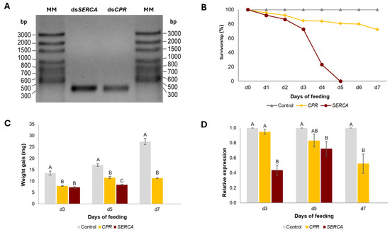 Synthesis and feeding assays of dsSERCA and dsCPR in Leptinotarsa decemlineata. (A) In vitro synthesis of dsSERCA and dsCPR (290 bp). (B) Survivorship percentage. (C) Average larval weight after days 3, 5, and 7 of treatment with dsSERCA and dsCPR. (D) Relative expression levels of SERCA and CPR genes in L. decemlineata larvae. Data are presented as means ± standard errors. Letters above each bar indicate significant differences between groups, determined by one-way ANOVA followed by Tukey’s test in Minitab® 20.3.