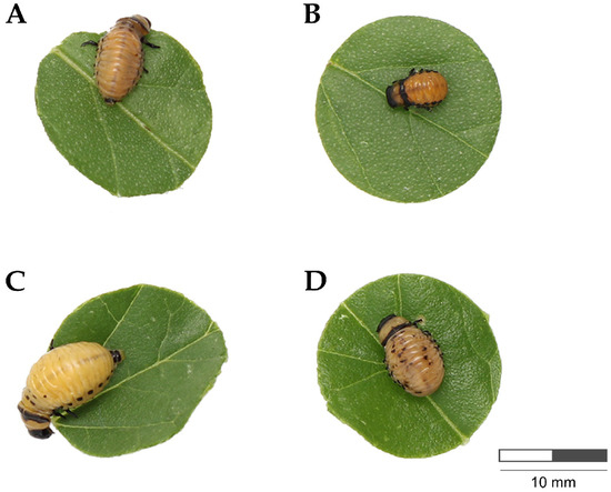 Adult beetles of L. decemlineata were collected from the field on silverleaf nightshade (Solanum elaeagnifolium Cav.) and buffalobur (Solanum rostratum Dunal) plants in Chihuahua, Chihuahua, Mexico (28°43′47″ N, 105°58′11″ W), during the period of August and September 2024. The beetles were maintained in a controlled environment within a terrarium, set to a temperature of 26 ± 2 °C, with relative humidity between 50% and 60%, and a 14 h light–10 h dark photoperiod (1200 lux). Silverleaf nightshade plants were provided as a food source.