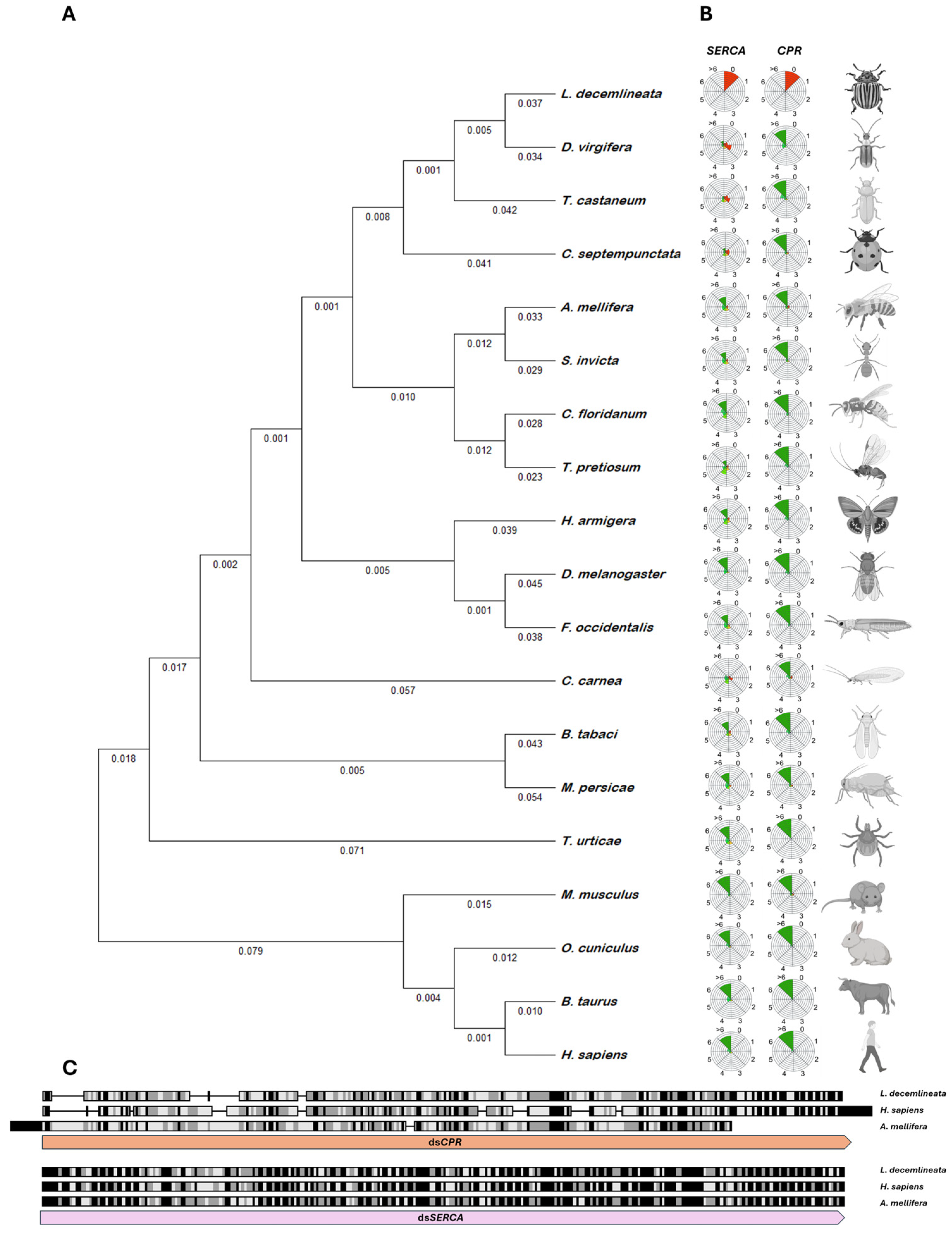 (A) Phylogenetic tree based on concatenated nucleic acid sequences from the SERCA and CPR genes of L. decemlineata, B. taurus, M. musculus, O. cuniculus, D. melanogaster, T. urticae, T. castaneum, A. mellifera, C. floridanum, C. septempunctata, H. armigera, B. tabaci, T. pretiosum, M. persicae, D. virgifera virgifera, C. carnea, S. invicta, F. occidentalis, and H. sapiens, constructed using the Neighbor-Joining Method with the software Molecular Evolutionary Genetics Analysis (MEGA) 11.0.10. (B) Theoretical potency analysis of each species was calculated using the QUT Nicotiana benthamiana RNA Target Tester Platform. Circles indicate the theoretical effectiveness of siRNAs produced by each dsRNA sequence designed for L. decemlineata. Twenty-one nucleotide siRNA sequences with 0, 1, or 2 mismatches are expected to target gene cleavage (red), while those with >3 mismatches are expected to have no significant RNAi effect (green). Sequences shown in orange are classified as potentially having an RNAi effect. (C) Alignment of CPR and SERCA coding sequences (+1 to +290 bp) from H. sapiens, A. mellifera, and L. decemlineata. Conserved residues are marked in gray and black boxes. The lower boxes indicate the target region of the dsSERCA and dsCPR sequences.