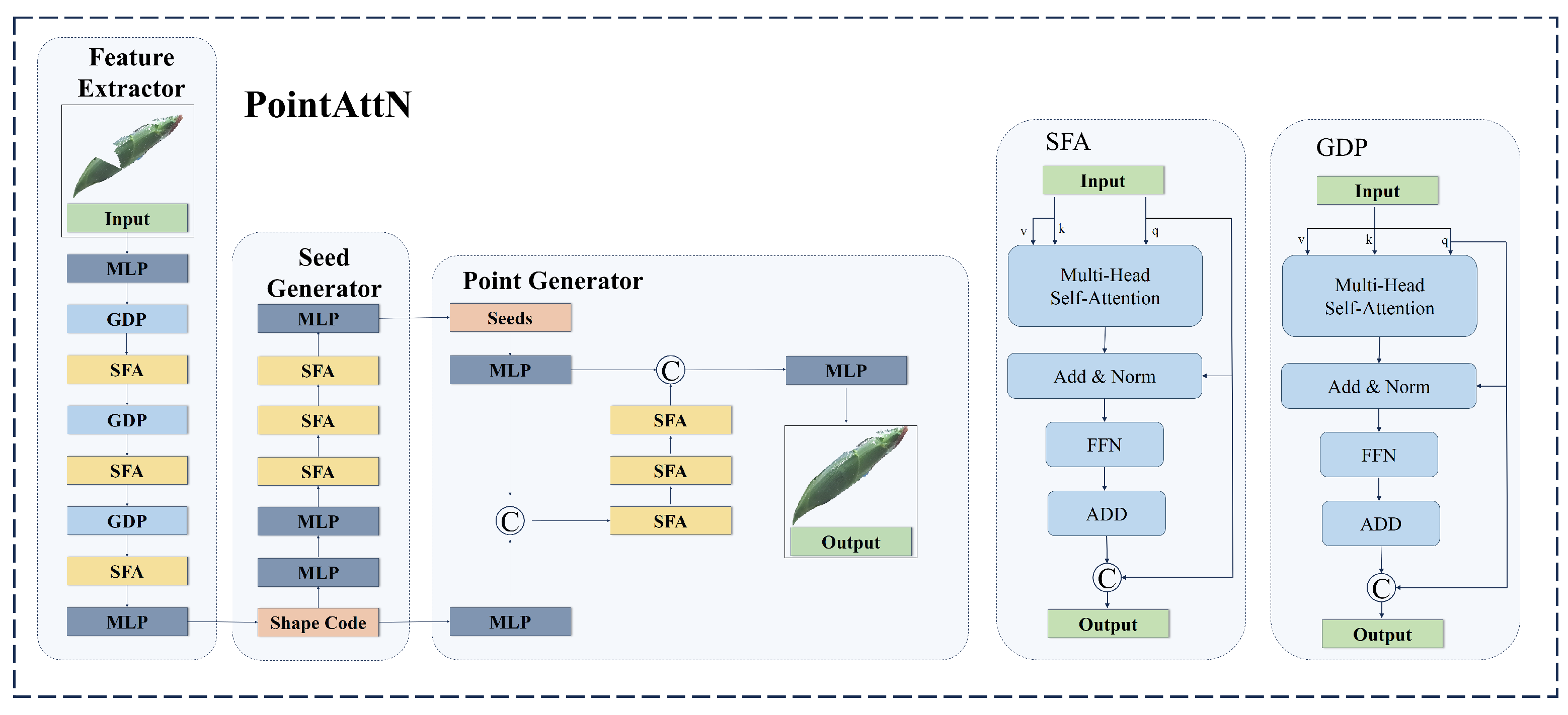 PointAttN is a point cloud completion framework designed to predict a complete 3D shape from an incomplete point cloud. It addresses the limitations of k-nearest neighbors (KNNs), which struggle to describe local geometric structures. Its key innovation is the elimination of explicit local region partitioning and the introduction of cross-attention and self-attention mechanisms to capture both short-range and long-range structural relationships among points. PointAttN consists of the following three main modules: the feature extractor, seed generator, and point generator. The feature extractor adaptively captures both local structural details and the global context of an object to generate a shape code. The seed generator takes the shape code as input to produce a sparse yet complete point cloud. Finally, the point generator refines this output by taking both the sparse point cloud and shape code as input. To achieve these, two key blocks are integrated within these modules as follows: the Geometric Details Perception (GDP) block, which facilitates information aggregation, and the Self-Feature Augmentation (SFA) block, which captures intricate geometric details about 3D shapes. The original PointAttN structure is illustrated in