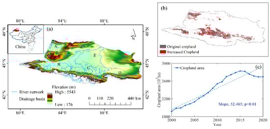(a) Location of the study area (A: Emin River Basin, B: Ebi Lake Basin, C: the central part of the northern slope of the Tianshan Mountains, D: the eastern part of the northern slope of the Tianshan Mountains, E: the Gurbantunggut Desert). (The map was edited based on standard national boundary (GS (2022) 1873), and the boundary was not modified.) (b) distribution of cropland in the study area, and (c) changes in cropland area from 2000 to 2020.