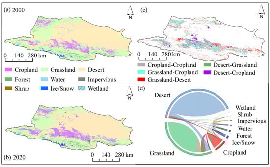 Land use type in the study area for 2000 (a) and 2020 (b), (c) spatial distribution of land use changes, and (d) chord diagram illustrating land use transitions.