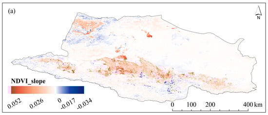 The Theil–Sen estimator was employed to examine the trend values of slopres and slopcli, derived from the annual NDVIres and NDVIcli, respectively. A positive value suggests that either climate variations or human activities are enhancing vegetation growth. In contrast, a negative value indicates that a reduction in vegetation is being prompted by either climate variations or human activities.