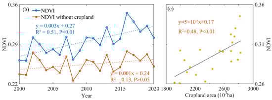 Temporal–spatial variations in NDVI from 2000 to 2020: (a) spatial distributions of NDVI trends using the Sen’s slope, (b) temporal trend variations in NDVI, the regional average and the areas without cropland, (c) the correlation between cropland area and regional average NDVI.