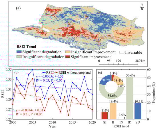 Temporal–spatial variations in RSEI from 2000 to 2020: (a) spatial distributions of RSEI, (b) temporal trend variations in RSEI, the regional average and the areas without cropland, (c) the proportion of different trends (the bar chart representing the entire region and the donut chart representing areas without cropland).