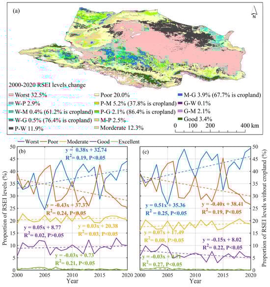 (a) Spatial distribution of RSEI levels transitions from 2000 to 2020 (W, P, M, G represent worst, poor, moderate, and good; W-P indicates a transition from worst to poor, and so on), (b) trends in RSEI levels proportions for the entire region, (c) trends without cropland.