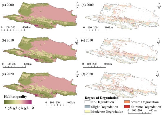 Spatial distribution of habitat quality (a–c) and degradation degree (d–f) in 2000, 2010, and 2020.