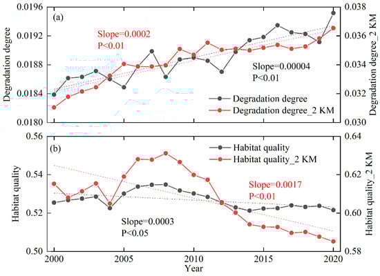 Trends in average habitat quality (a) and degradation degree (b) from 2000 to 2020 for the study area and a 2 km buffer around croplands.