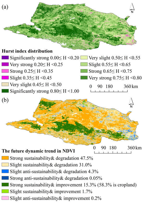 The characteristic of changes in future NDVI: (a) the spatial distribution of Hurst index, (b) the future dynamic trend in NDVI.