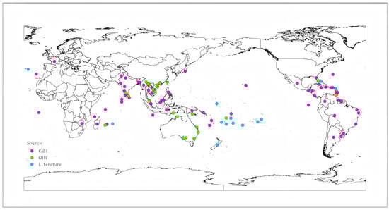 Global occurrence records of P. minor. Pink dots from CABI; green dots from GBIF; blue dots from published studies.