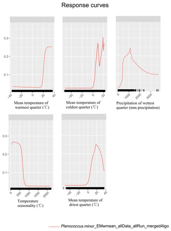 The environmental response curves for P. minor under the ensemble model (Figure 2) indicated that temperature and precipitation were key factors influencing habitat suitability. For bio10 (mean temperature of the warmest quarter), the probability of species occurrence increased rapidly as the temperature approached 20 °C, then stabilized. The suitability for bio11 (mean temperature of the coldest quarter) gradually increased between 0 °C and 12 °C, followed by a sharp change between 12 °C and 25 °C. Bio9 (mean temperature of the driest quarter) showed peak suitability around 18 °C. For bio16 (precipitation of the wettest quarter), the probability of species occurrence peaked at approximately 1000 mm and then declined, suggesting that excessively high precipitation may inhibit the distribution of P. minor. Similarly, the response curve for bio4 (temperature seasonality) peaked around a value of 125 and then decreased, indicating that large temperature fluctuations may negatively impact the survival of the species. These results suggest that P. minor prefers environments characterized by warm temperatures, moderate precipitation, and relatively stable climatic conditions.