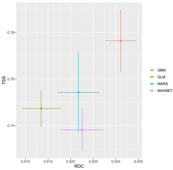 - Allouche, O.; Tsoar, A.; Kadmon, R. Assessing the Accuracy of Species Distribution Models: Prevalence, Kappa and the True Skill Statistic (TSS). J. Appl. Ecol. 2006, 43, 1223–1232. [Google Scholar] [CrossRef]