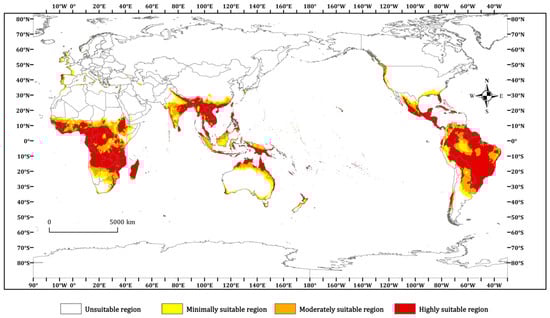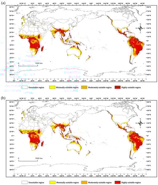 Under current climatic conditions, the global prediction results for P. minor indicated that its suitable habitat was primarily concentrated in tropical and subtropical regions (Figure 4). Highly suitable areas were distributed across sub-Saharan Africa (including the Congo Basin, Nigeria, and neighboring countries), South and Southeast Asia (India, Sri Lanka, Bangladesh, Thailand, Malaysia, Indonesia, etc.), the Amazon Basin in South America (Brazil, Bolivia, Colombia, Guyana, Suriname, etc.), Central America, the southern regions of North America, and the northern and eastern coastal areas of Australia. Additionally, the islands of Polynesia and Melanesia were also identified as highly suitable regions for P. minor. Moderately and minimally suitable habitats were primarily distributed in peripheral areas and transitional zones surrounding highly suitable regions. These include parts of Southeast Asia, the southern United States, and Mexico in North America; northern Argentina and Peru in South America; Mediterranean coastal countries; and the Federated States of Micronesia.