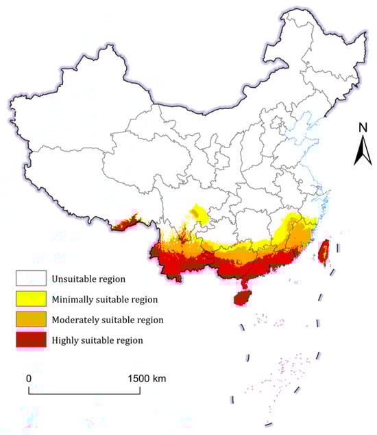 Suitability distribution of P. minor in China under current climate conditions. The suitable habitats for P. minor are primarily distributed in southern provinces, forming a belt-like pattern.