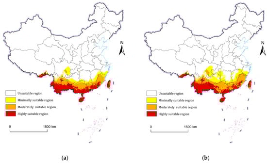 Suitability distribution of P. minor in China under two socio-economic pathways and carbon emission scenarios for the 2050s. (a) SSP1-2.6: a low-emission, sustainable development pathway; (b) SSP5-8.5: a high-emission, rapidly changing pathway.