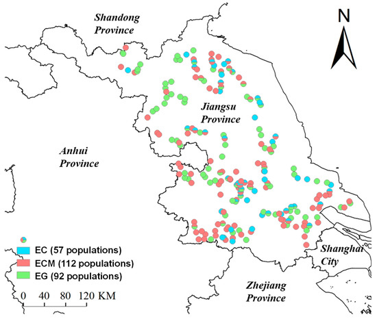 Collection sites of Echinochloa crus galli (L.) P. Beauv. (EC), E. crus-galli var. mitis (Pursh) Petermann (ECM), and E. glabrescens Munro ex Hook.f. (EG) populations in rice fields from Jiangsu province, China.
