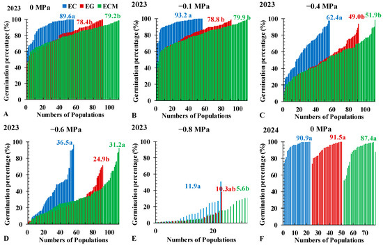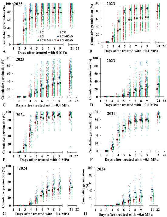 All of 261 Echinochloa populations were tested in 2023. In 2024, a repeated experiment was conducted with 76 populations, including 24 EC, 26 ECM, and 26 EG populations. Polyethylene glycol 6000 (PEG-6000) was used to simulate drought stress due to its inability to penetrate plant cell membranes and walls [14]. PEG-6000 solutions with osmotic potential of −0.1, −0.4, and −0.6 MPa were used to simulate various levels of drought stress, with sterile water serving as the control (CK), and −0.8 MPa treatment was conducted with 81 populations in 2023, including 24 EC, 33 ECM and 24 EG populations to verify the germination limit. For each Petri dish, 50 undamaged seeds were evenly placed in 9 cm diameter Petri dishes with two layers of filter paper moistened with 6 mL Polyethylene glycol solution. The dishes were sealed with parafilm to prevent evaporation and placed in a growth chamber with a constant temperature of 30/20 °C (day/night, light 12 h/dark 12 h, 12,000 lux). Each treatment replicated three Petri dishes. Percentage germination of each Petri dish was determined daily for 9 d, and the final germination percentage was recorded at 21 days. Seeds were considered germinated once the coleoptile or radicle had appeared.