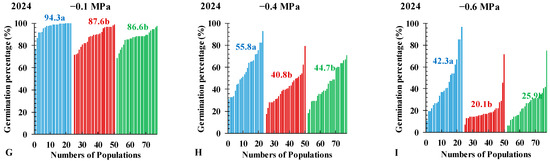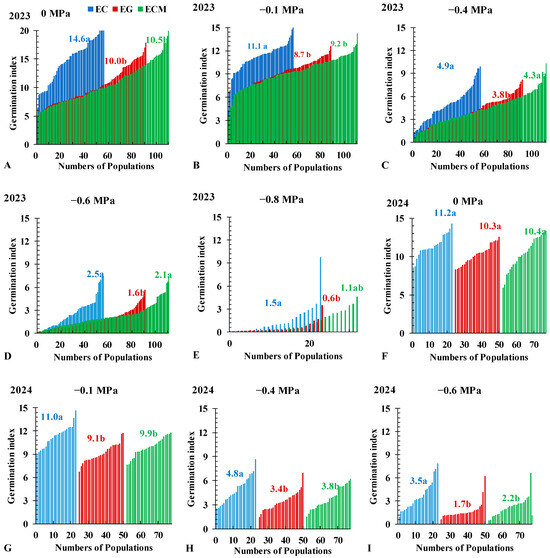 The average GIs of three Echinochloa species decreased significantly with decreasing osmotic potential (Figure 5A–I). The CVs of the three Echinochloa species decreased (from 0 MPa to −0.1 MPa) and then increased (from −0.1 MPa to −0.6 MPa; Table S3). In the 2024 experiment, no significant difference in average GI was observed among the three species at 0 MPa (Figure 5F). However, from −0.1 MPa to −0.6 MPa, EC exhibited significantly higher GIs than ECM and EG (Figure 5G–I). At −0.8 MPa, the average GI of EG was significantly lower than that of EC and ECM, with values of 1.5, 1.1, and 0.6, respectively (Figure 5E).