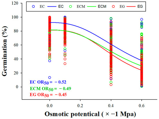 OR50 (the osmotic potential at which germination percentage reaches 50%) curves of Echinochloa crus-galli (L.) P.Beauv. (EC), E. glabrescens Munro ex Hook.f. (EG) and E. crus-galli var. mitis (Pursh) Petermann (ECM).