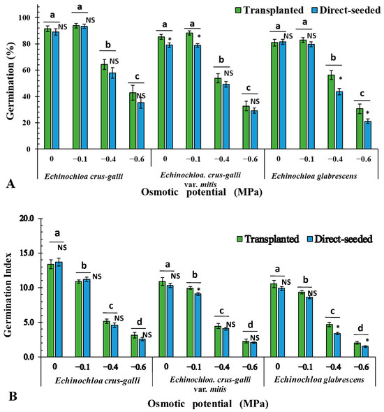 Average germination percentage (A) and germination index (B) of different species populations collected from fields with varying rice planting methods under different osmotic potentials. Different letters indicate significant (p < 0.05) differences among treatments within the same species. *: significant (p < 0.05) difference between the two sets of data. NS: No significant (p < 0.05) difference between the two sets of data.