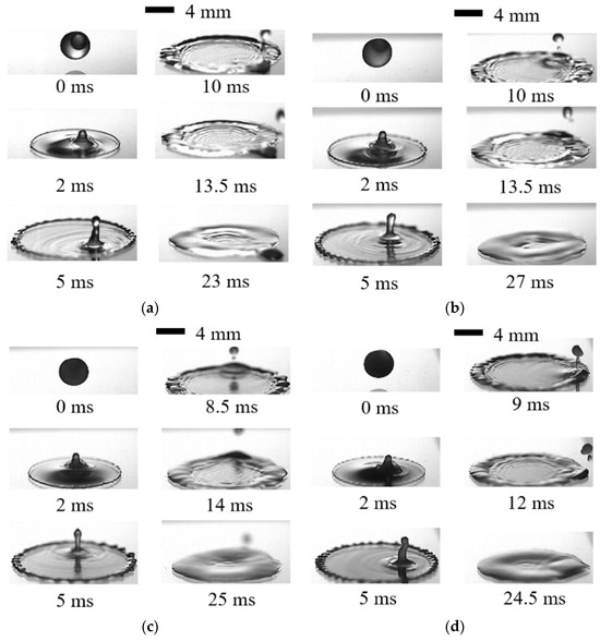 In Figure 14b, for 0.4% suspension bubble-containing droplets, the retracted liquid moved upward at 18 ms and left the surface at 25 ms. For 0.6% suspension bubble-containing droplets in Figure 14c, the retracted liquid bounced upward at 14 ms, completed contraction in the air, and continued moving upward until it left the surface between 20 ms and 26 ms.