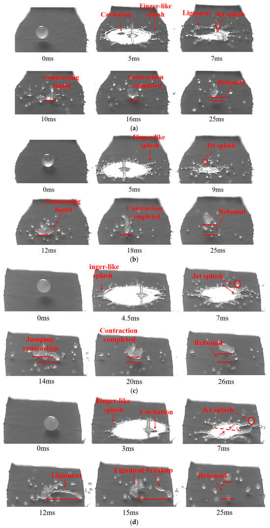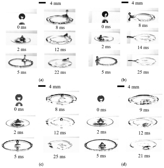 As shown in Figure 14a, for 0.2% suspension bubble-containing droplets, pores and edge finger-like splashing appeared at 5 ms. At 7 ms, the pore rupture caused the surrounding liquid to form ligaments, which broke and caused splashing, with edge droplets also being ejected from the tips of the finger-like structures. Between 10 ms and 25 ms, the droplet’s spread diameter retracted and rebounded.