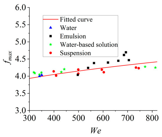 On hydrophilic surfaces, the deposition processes of bubble-containing droplets with different pesticide solutions are similar. Droplet spreading is mainly influenced by surface tension. As the pesticide concentration increases, the surface tension continuously decreases, leading to an increase in the droplet-spreading diameter. A larger spreading diameter results in greater viscous dissipation, which reduces the height of the rebounding jet. Based on experimental data, a function curve of the maximum spread factor versus the dimensionless parameter We was fitted, with the expression .