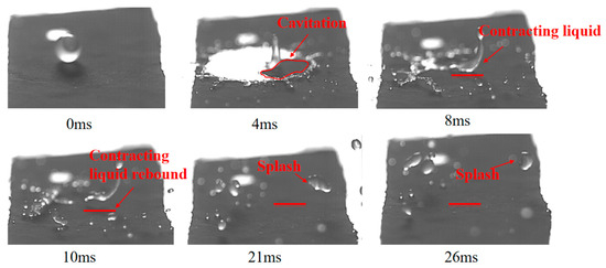 At an emulsion concentration of 0.4%, as depicted in Figure 11, the droplets adhere to the hydrophobic leaf surface. At 5 ms, the bottom of the emulsion droplet with bubbles starts to form pores, which subsequently enlarge and rupture, creating unstable ligament-like liquids on the surface. These unstable liquids either rebound, splash away, or remain on the leaf surface. By 9 ms, the splashed liquid has lost energy, reduced the rebound kinetic energy, and suppressed the retraction of the droplet. Between 9 ms and 26 ms, the retracted liquid is pulled upward by the inertia of the upward central jet (noted at 9 ms). This occurred at 0.2% concentration, but at 0.4% concentration, the retracted liquid adheres firmly to the leaf surface instead of leaving with the central jet. The central jet separates from the retracted liquid after failing to pull it away and undergoes secondary splashing (observed at 11 ms). At 26 ms, some small droplets remain on the leaf surface.