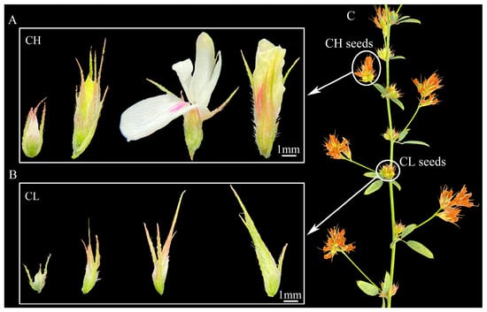 The ‘Tenggeli’ cultivars of L. potaninii seeds, provided by Lanzhou University breeders, were used. L. potaninii develops both CH and CL flowers, as well as corresponding CH and CL seeds, but there are differences in their morphology and attachment positions (Figure 1). Four floral developmental stages were defined based on the flower morphology, including the squaring stage, the early flowering stage, the peak flowering stage, and the late flowering stage. There are visible yellow petals during the CH early flowering stage, white petals during the CH peak flowering stage, and creamy-white petals during the CH late flowering stage, while there are no visible petals during all the flowering stages of CL (Figure 1A,B). In addition, CH flowers have a relatively long flower stalk, while CL flowers are attached at the base of the leaves with a nearly invisible flower stalk. Similarly, CH seeds are attached to a relatively long flower stalks, while CL seeds are attached at the base of the leaves (Figure 1C).