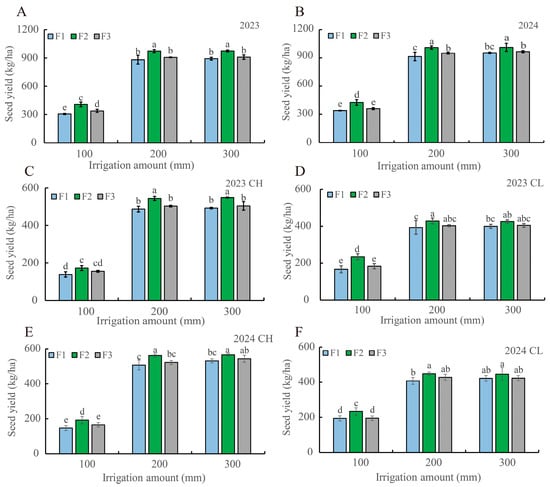 Irrigation amounts and fertilizer types affect L. potaninii total seed yield (A,B), seed yield of the CH part (C,E), and seed yield of the CL part (D,F) in 2023 and 2024. F1, control; F2, P fertilizer; F3, organic fertilizer. Different lowercase letters present significance at the 0.05 level.