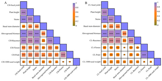 Correlation analysis of L. potaninii seed yield of CH (A) and CL (B) and yield components in 2023 and 2024. ** and *** present the significance level at p < 0.01 and p < 0.001.