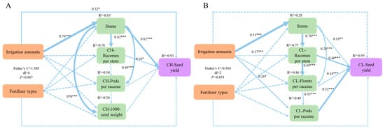 Structural equation modeling (SEM) revealed direct and indirect effects of irrigation amounts, fertilizer types, and yield components on the seed yield of CH (A) and CL (B). The numbers next to the arrows represent the standardized path coefficient. Solid arrows represent a direct effect, dashed arrows represent an indirect effect, and line width indicates intensity proportion. R2 represents the proportion of variance in each dependent variable that is explained by the model. *, **, and *** represent significance at p < 0.05, p < 0.01, and p < 0.001.