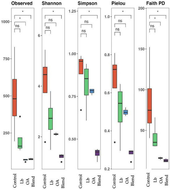 Bacterial alpha diversity indices (Observed, Shannon, Simpson, Pielou, and Faith PD) in BRS Ponta Negra forage sorghum silage supplemented with chemical or microbial additives and their combinations during the fermentation period at 90 days after ensiling. Control: control (no additive); Lb: commercial inoculant based on Lentilactobacillus buchneri NCIMB 40788, Lallemand®, Brazil; OA: chemical additive based on organic acids Fresh CUT™ Plus, Kemin Industries®, Brazil; Blend: combination of Lb + OA. Significance levels: ns = not significant; * p < 0.05.