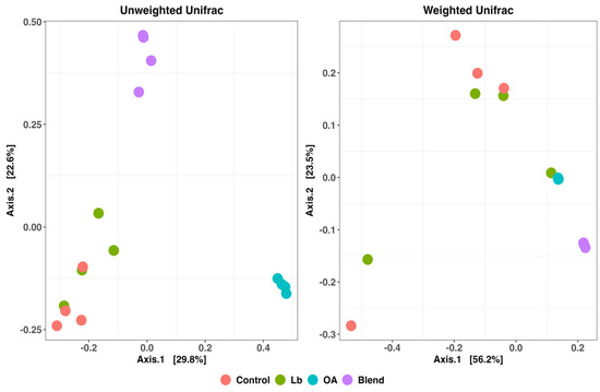 Bacterial beta diversity indices (unweighted Unifrac and weighted Unifrac) in BRS Ponta Negra forage sorghum silage added with chemical or microbial additives and their combinations during the fermentation period at 90 days after ensiling. Control: control (no additive); Lb: commercial inoculant based on Lentilactobacillus buchneri NCIMB 40788, Lallemand®, Brazil; OA: chemical additive based on organic acids Fresh CUT™ Plus, Kemin Industries®, Brazil; Blend: combination of Lb + OA.