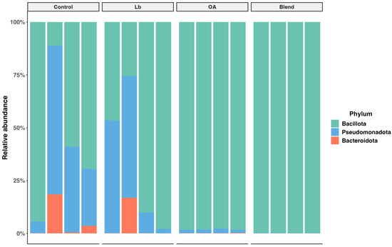 Relative abundance at the bacterial phylum level in BRS Ponta Negra forage sorghum silage added with chemical or microbial additives and their combinations during the fermentation period at 90 days after ensiling (n = 4). Control: control (without additive); Lb: commercial inoculant based on Lentilactobacillus buchneri NCIMB 40788, Lallemand®, Brazil; OA: chemical additive based on organic acids Fresh CUT™ Plus, Kemin Industries®, Brazil; Blend: combination of Lb + OA.