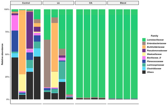 The family Lactobacillaceae was primarily responsible for fermentation, dominating the metataxonomic diversity in silages added with Lb, OA, and Blend. In contrast, the Control silage exhibited an increase in other taxa, such as Enterobacteriaceae, Burkholderiaceae, Pseudomonadaceae, Bacillaceae_D, Planococcaceae, and Clostridiaceae (Figure 4).