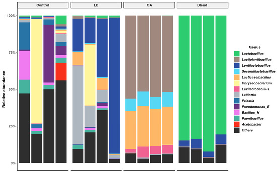 Relative abundance of bacterial genera in forage sorghum silage added with chemical or microbial additives and their combinations during the fermentation period 90 days after ensiling (n = 4). Control: control (no additive); Lb: commercial inoculant based on Lentilactobacillus buchneri NCIMB 40788, Lallemand®, Brazil; OA: chemical additive based on organic acids Fresh CUT™ Plus, Kemin Industries®, Brazil; Blend: combination of Lb + OA.