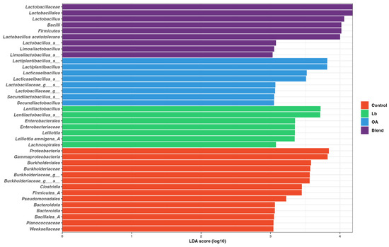 As illustrated in Figure 6, the differential abundance analysis revealed distinct taxonomic profiles among the silages. The Control silage was characterized by a predominance of taxa such as Proteobacteria and Bacteroidota, whereas the silages treated with Lb and OA promoted specific genera within the Lactobacillaceae family. The Blend treatment also enriched for several Lactobacillus-related taxa, although with a different composition compared to the other treated silages. This LEfSe-based analysis (LDA effect size) highlights how the inclusion of microbial inoculants, chemical additives, or their combination selectively influenced the enrichment of bacterial groups. It is important to note that the differential abundance was assessed between treatment groups and does not reflect overall diversity indices such as alpha or beta diversity.