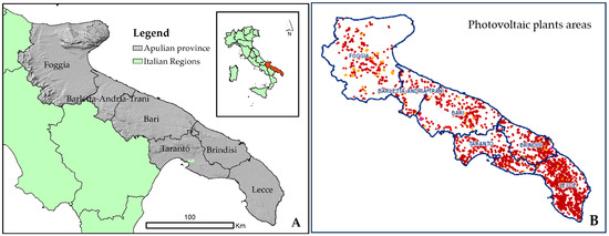 (A) Apulia region and its six provinces were considered as the study area. (B) Spatial density of photovoltaic installations in Apulia [39].