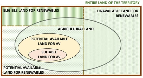 At the first level, the regulatory framework allows us to distinguish between eligible, unavailable, and available land for renewable energy installations. A GIS-based assessment of land availability allows these areas to be identified and mapped. At the second level, embedded within the available land, and considering only agricultural land, the potentially available land for AV systems was mapped. A land suitability analysis (not an objective of the present work) further allows the selection and matching of AV feasibility criteria with land-specific characteristics to obtain suitable AV areas. (AV: agrivoltaic systems).