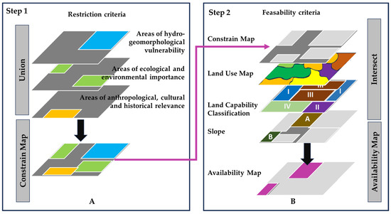 Figure 3. The first two steps of the applied methodological approach. (A) The Constraint Map was developed by the union of all the constrained areas in the region; (B) The Availability Map was developed by intersecting the Constraint Map with feasibility criteria such as land capability, terrain slope, and exposure.