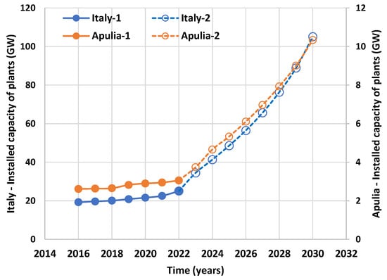 Time trends of photovoltaic installations both at the national level (Italy) and at the regional level (Apulia). The “full dots” refer to installations already implemented by 2022 (Italy-1 and Apulia-1), while the “empty dots” refer to installations foreseen by the National Energy and Climate Plan (NECP) and the Ministerial Decree dated 21 June 2024 (Italy-2 and Apulia-2).