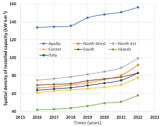 Time trends of the spatial density of photovoltaic installations at the national level (Italy), regional level (Apulia), and also considering regions of Italy statistically combined into five groups: north-western, north-eastern, central, southern, and islands. Data refer to energy plants built up to 2022, the year in which the National Energy and Climate Plan (NECP) was adopted.
