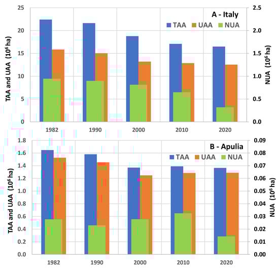Total agricultural area (TAA), utilized agricultural area (UAA), and non-utilized agricultural area (NUA) with reference to the national scale (A) and the regional scale of the Apulia region (B). The data presented refer to the national agricultural censuses (from ISTAT).