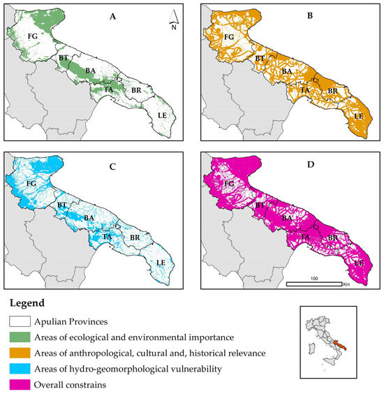 Geographical maps (A–C) of each component of the “protection system” and of specific sets of constraints from both the Apulian Landscape Plan (ALP) and the Hydro-Geological Plan (HGP). Geographical map (D) of the entire regional constraint system.