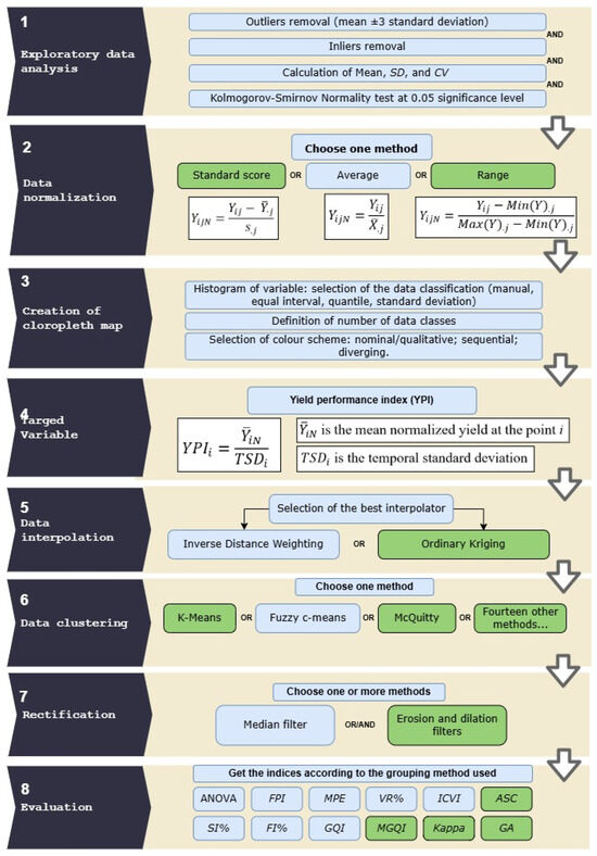 The yield values were normalized () using the mean method (Equation (1)) [2,20,26] to stabilize these data, which are often heavily influenced by variations in climate and precipitation. Then, since there is more than one year of yield data for each field, the arithmetic mean of the normalized yield was calculated, generating a single variable corresponding to the mean normalized yield (). After that, yield choropleth maps (Figure 1 (step 3)) were created to evaluate the yield distribution visually.